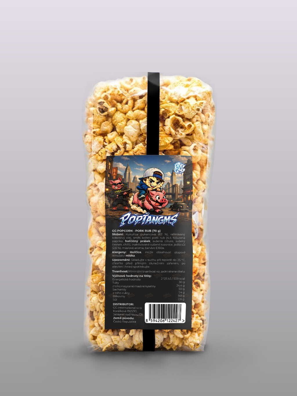 Složení Kukuřice pukancová (67 %), rafinovaný kokosový olej, směs koření pork rub (4,4 %) (uzená paprika, hořčičný prášek, sušená cibule, sušený česnek, chilli), inaktivované sušené kvasnice, jedlá sůl (2,6 %), máslové aroma, barvivo E160a.