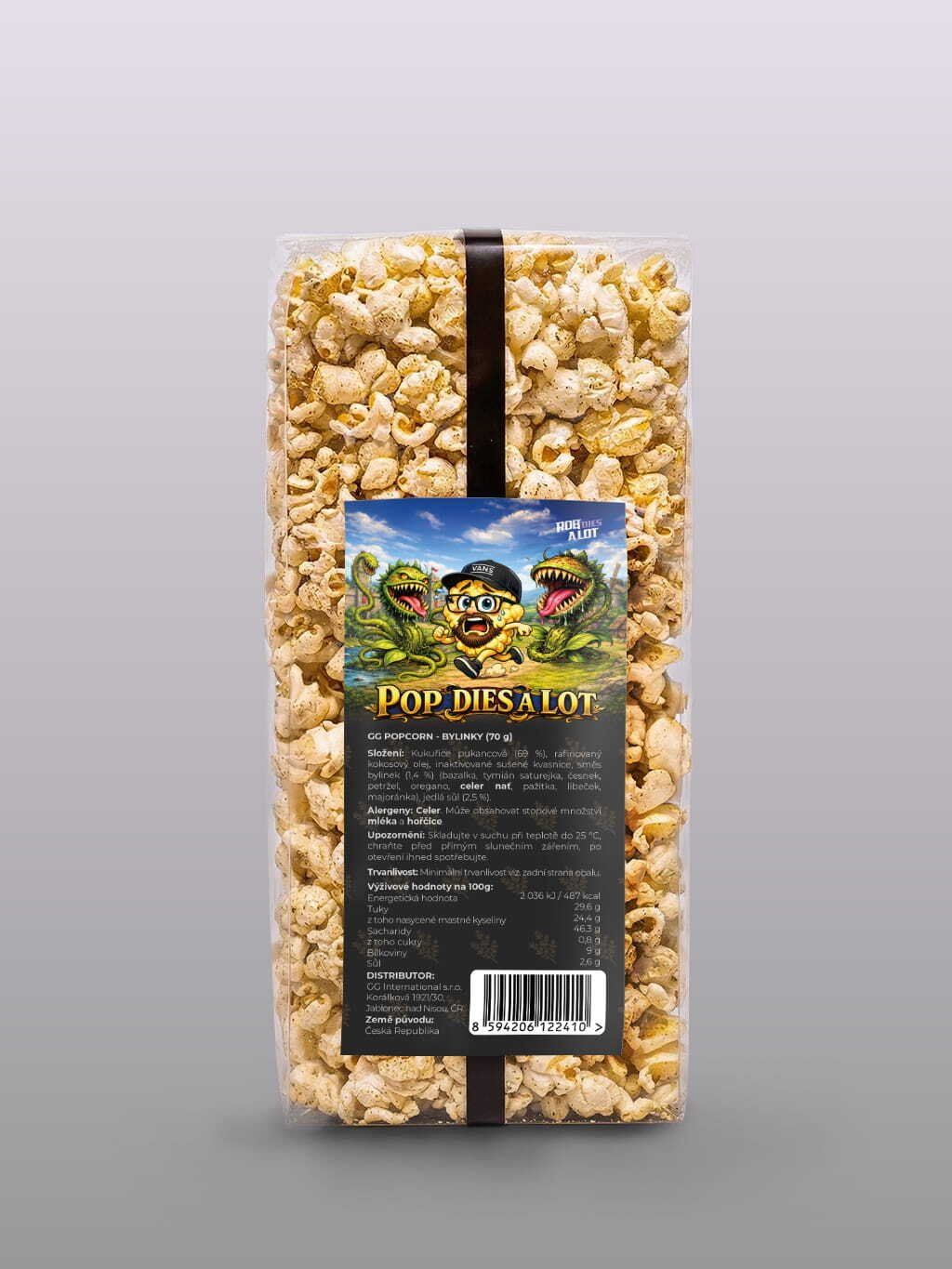 Složení Kukuřice pukancová (69 %), rafinovaný kokosový olej, inaktivované sušené kvasnice, směs bylinek (1,4 %) (bazalka, tymián saturejka, česnek, petržel, oregano, celer nať, pažitka, libeček, majoránka), jedlá sůl (2,5 %).