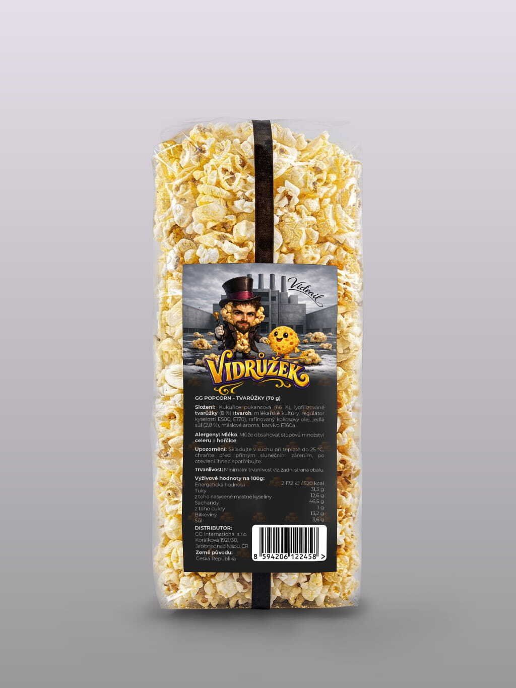 Složení Kukuřice pukancová (66 %), lyofilizované tvarůžky (8 %) (tvaroh, mlékařské kultury, regulátor kyselosti E500, E170) rafinovaný kokosový olej, jedlá sůl (2,8 %), máslové aroma, barvivo E160a.