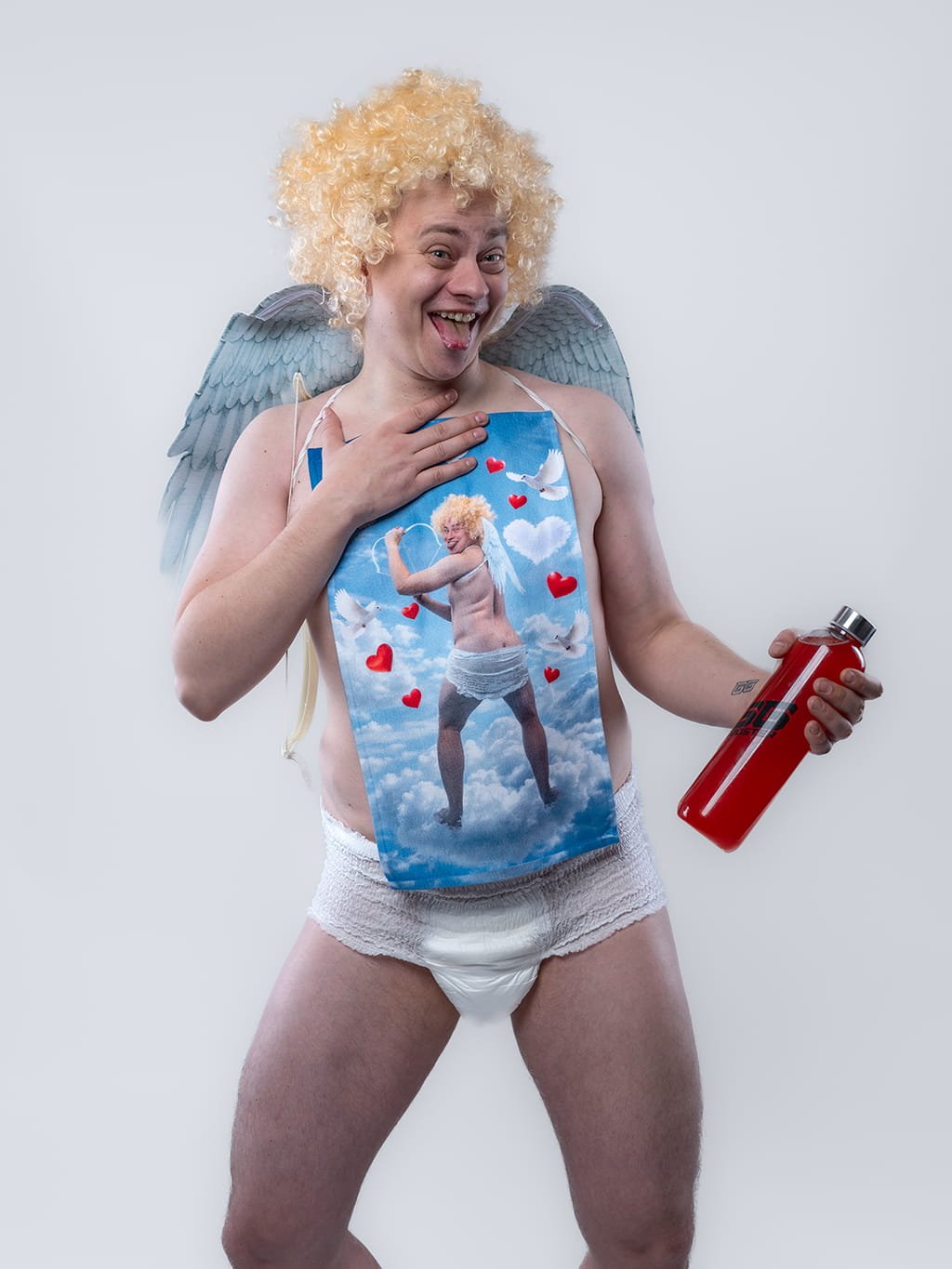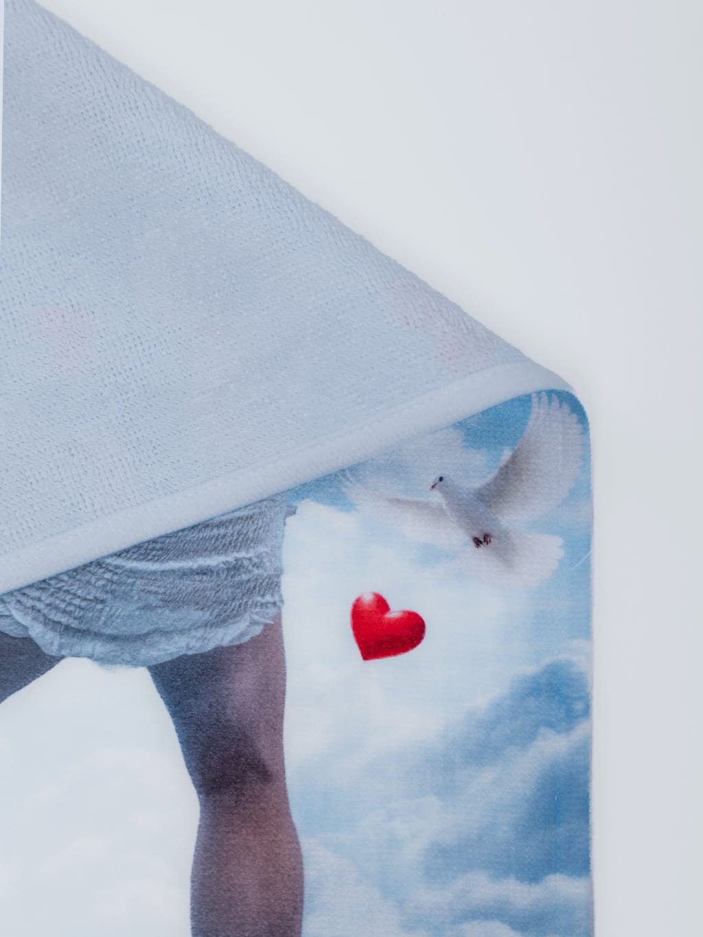 Bender jako Cupid s křidélky, srdíčky a holubičkami na celopotištěné straně. Velikost 29 × 50 cm, gramáž 350 g/m². Z jedné strany 100% bavlna pro příjemný kontakt s pokožkou, z druhé 100% polyester pro ostrý a výrazný celoplošný motiv.